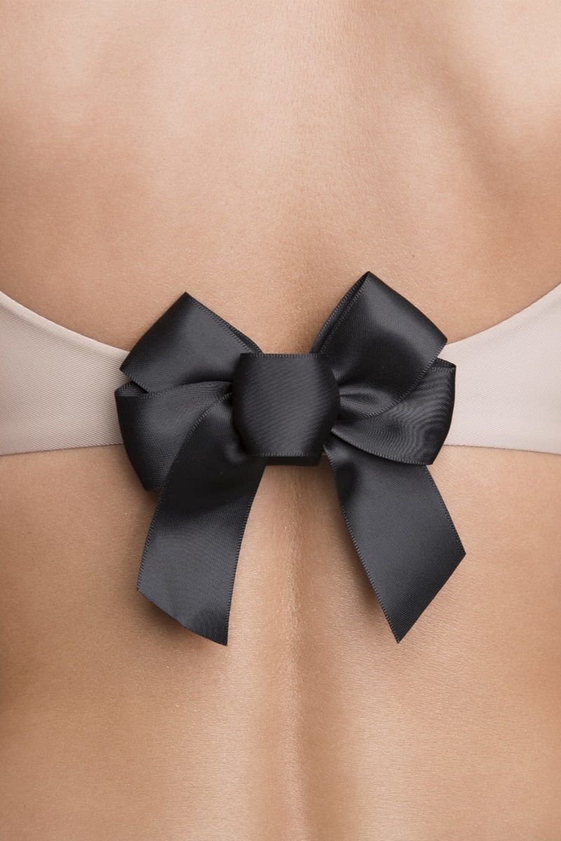 Черный, незаметно мерцающий бант из высококачественной ленты с широкой эластичной резинкой, сложенной вдвое, позволит вам скрыть застёжку бюстгальтера, дополнительно являясь оригинальным украшением большого выреза одежды на спине.