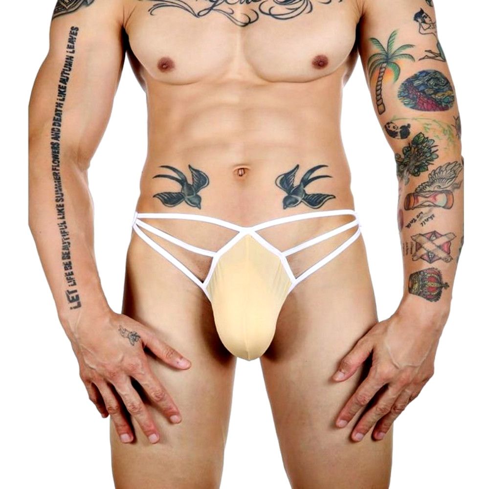 Бежевые сексуальные трусы-стринги на тонких белых бретелях.