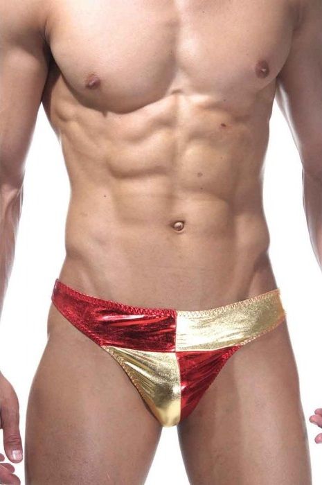 Тонги с низкой посадкой, у которых в шахматном порядке скомбинированы два цвета гладкой и блестящей ткани, красного и золотого цветов. Сзади трусы однотонного красного цвета.