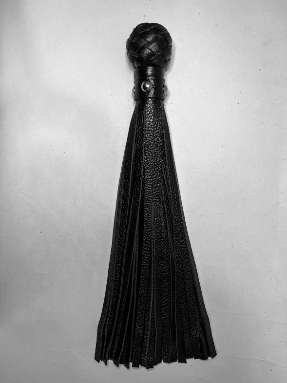 Изящная генитальная плеть, выполненная из натуральной кожи чёрного цвета. Мини-рукоятка декорирована плетением и металлической фурнитурой, очень комфортно ложится в руку! Плеть очень красивая, стоит только взять ее в руки, и уже не хочется отпускать. Эта малышка добавит огня и новых впечатлений в любовную игру!