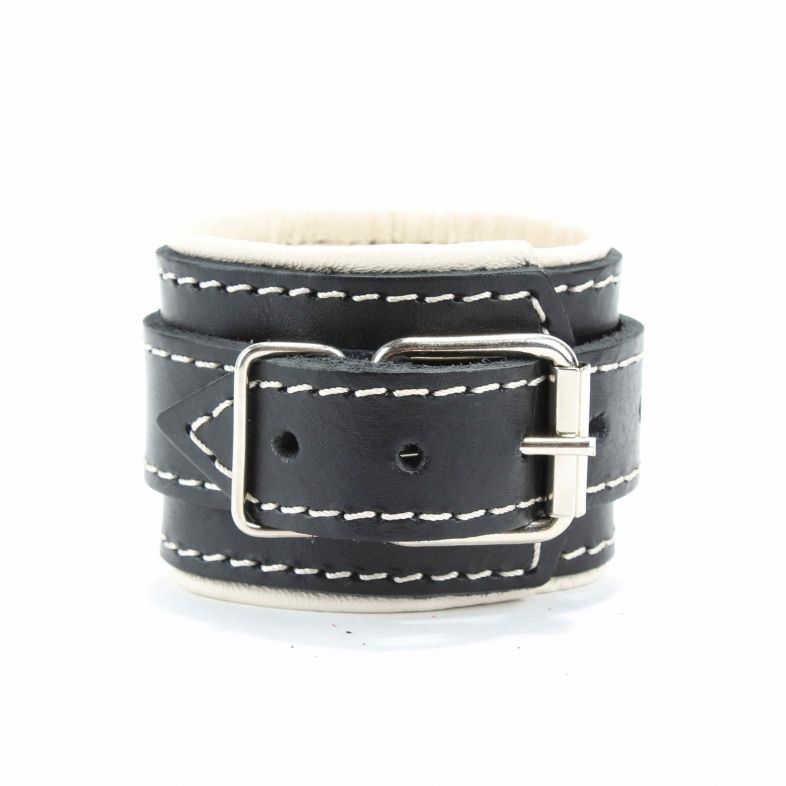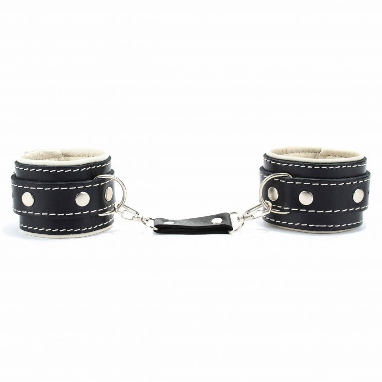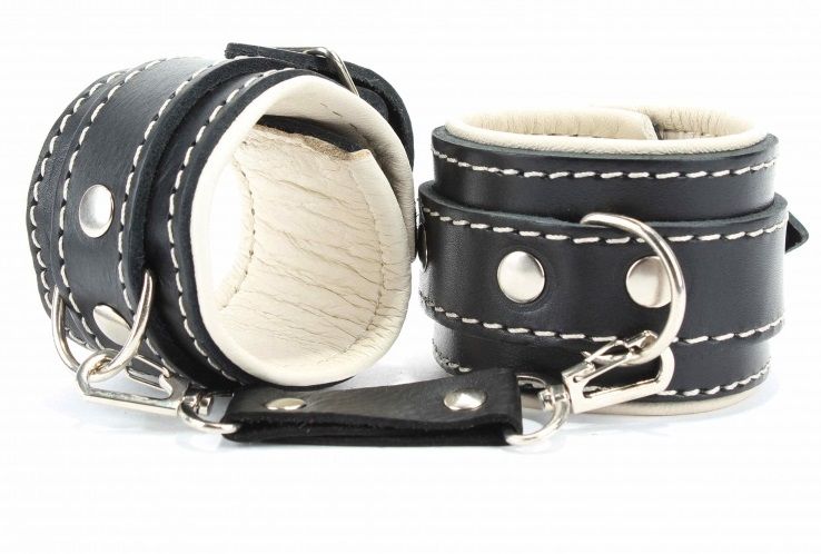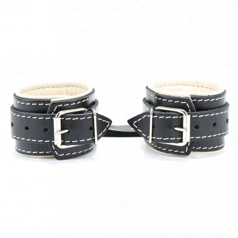 Оковы на ноги с бежевым подкладом. Выполнены из толстой ременной кожи черного цвета, подклад мягкая перчаточная кожа светло бежевого цвета. На пряжке. Использована усиленная металлическая фурнитура. Строчка толстой ниткой контрастного светлого цвета.