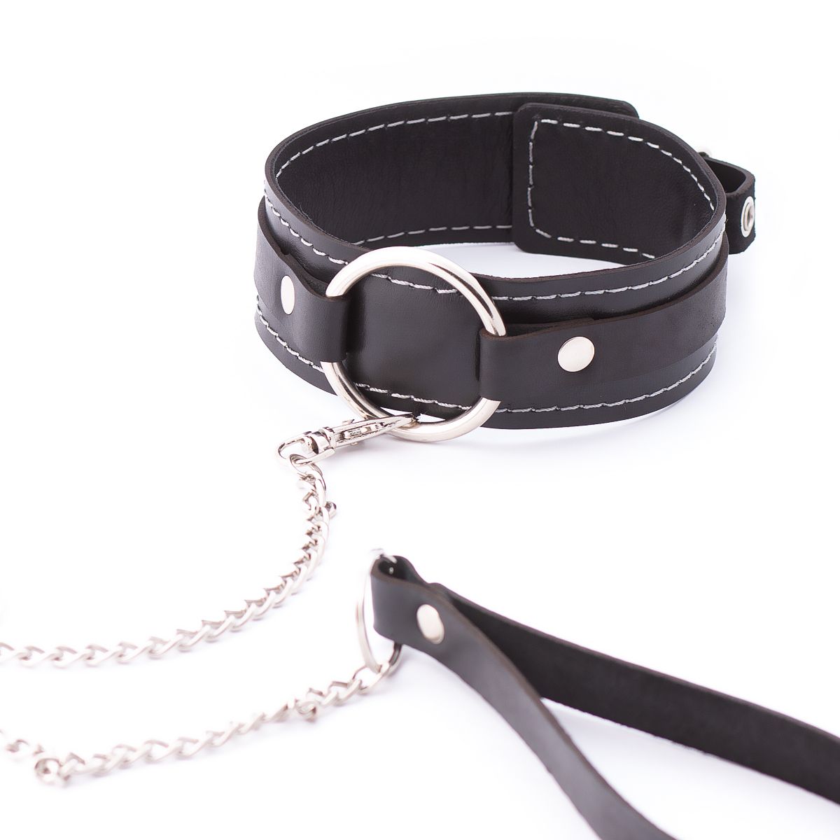 Двухслойный ошейник-чокер из натуральной кожи с мягкой подкладкой, позволяющей пользоваться изделием абсолютно безопасно. Прошит белой декоративной строчкой. На внешней стороне ошейника-чокера расположено стальное хромированное кольцо. В комплект входит поводок с прочной стальной цепочкой, карабином и ручкой-петлей из натуральной кожи. Общая длина - 47 см. Ширина - 4 см. Обхват - 34-44 см. Длина поводка - 84 см.