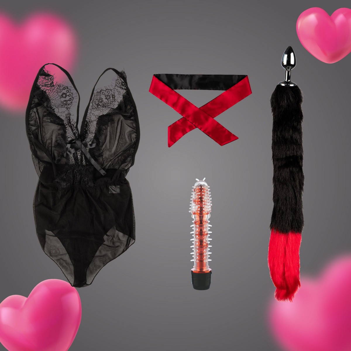 Набор состоит из нижнего белья (боди размера S-M), сатиновой повязки на глаза, металлической анальной пробки с хвостом из искусственной шерсти и силиконового вибратора с шипами. Возбуждающее нижнее белье наряду с секс-игрушками возбудит каждого мужчину, внесет в ролевые игры разнообразие. Без косточек и пуш-ап. Открытая спина и плечи. Трусы в форме бразилиана. Эротическая лента - это особый аксессуар, который выглядит очень невинно. Используется для фиксации партнера, ваших рук, ног и туловища - отличный способ разнообразить вашу сексуальную жизнь, который нравится обоим партнерам. Лента мягко фиксирует запястья или лодыжки вашего партнера, ее можно использовать для связывания, в качестве повязки на глаза или как предмет одежды. Мягкий материал ленты не обжигает кожу и не вызывает дискомфорта во время игры, вы можете полностью отдаться страсти без последствий, лента не оставляет следов после любовной игры. Анальная пробка с хвостом придаёт незабываемые ощущения от двойного проникновения. Конусообразная форма обеспечивает комфортное введение. Дополняет игривый образ. За счёт рельефной формы и мягких силиконовых усиков, вибратор подходит для стимуляции вагины, клитора, сосков и других эрогенных зон. Материал боди: 95% полиамид, 5% эластан. Длина ленты - 120 см, ширина - 6 см. Длина пробки с хвостом - 46 см, диаметр - 2,6 см. Длина вибратора - 17,5 см, диаметр - 3,5 см.