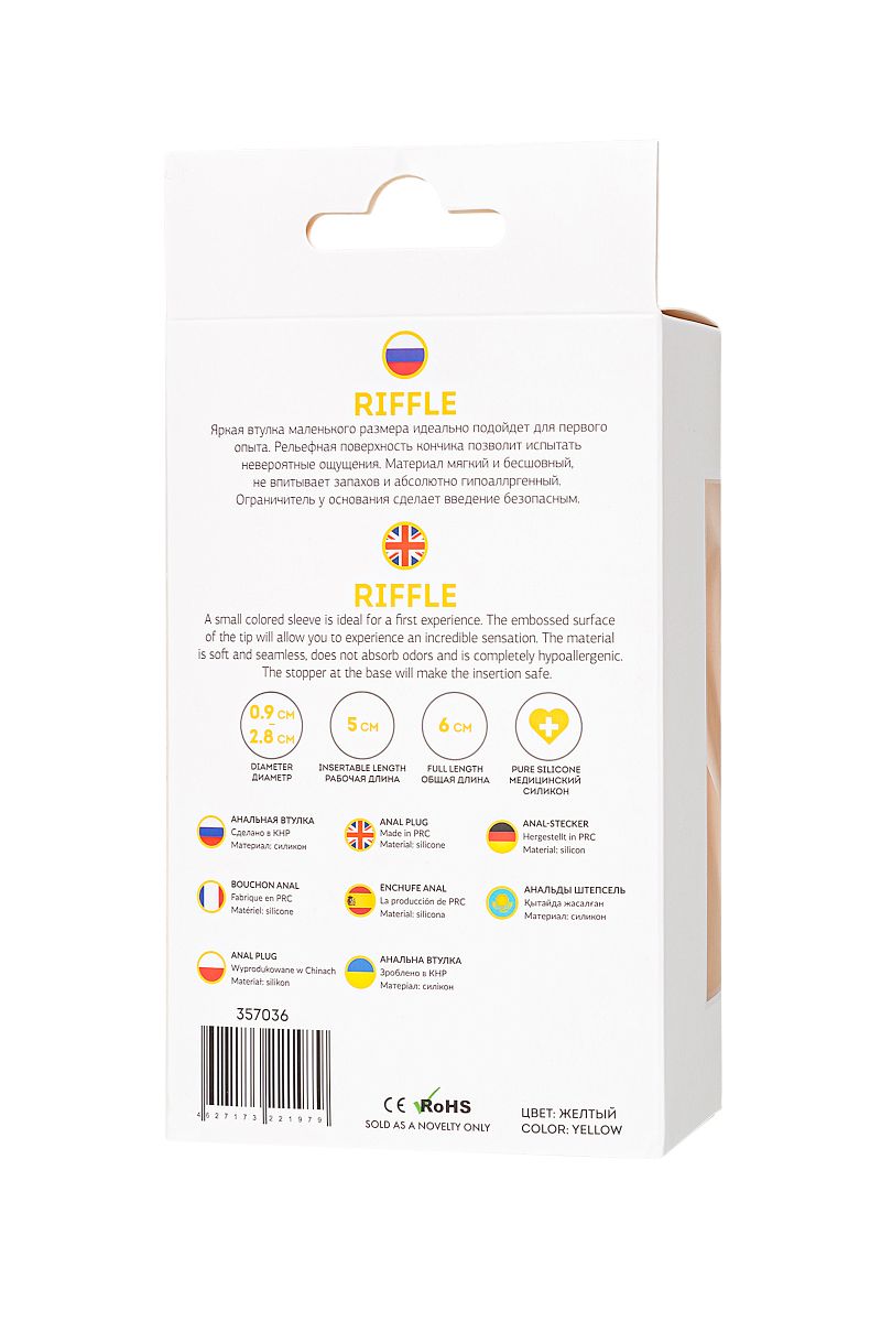 В секс-шопе Orgasmix вы можете купить Желтая анальная втулка Riffle - 6 см. артикул 222894 по цене руб. с доставкой в город Иркутск. Мы осуществляем доставку по всей России. Ближайшая дата отправки этого товара . Заказы принимаются круглосуточно через интернет-магазин.